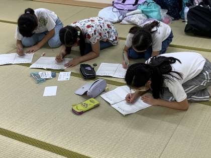 お風呂タイムを利用して、今日一日を振り返って日誌を書いています。合わせて、葉書も書いていました。