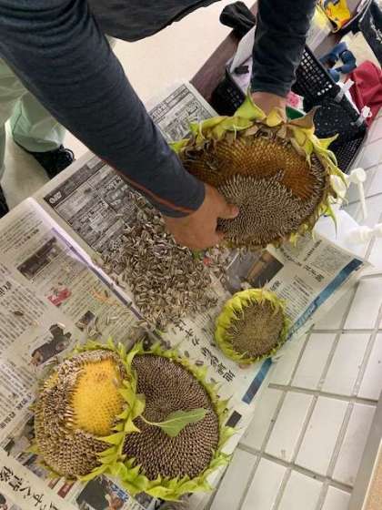 夏休みも残りわずかとなりました。今日は、大きく元気に咲いていた『はるかのひまわり』の種を収穫しました!