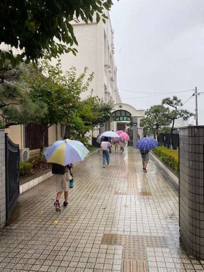 登校時間に合わせたように雨が降ってきました。その雨を吹き飛ばすかのように子どもたちは元気にあいさつ、笑顔であいさつしています(^^)