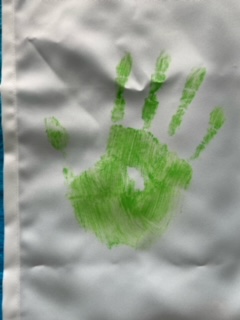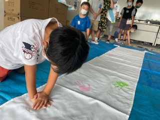 学校創立150年の横断幕にみんなで手形をつけていきます。まずは2年生からスタート、絵の具の感触を楽しみながらしっかりと押さえていました。完成が楽しみですね(^^)
