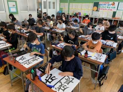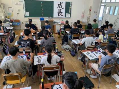 2学期最初の習字は、『成長』と書きました。字のバランスや、はらい、はねを気をつけて書きました。書き始めると教室内がシーンと静かになりました。