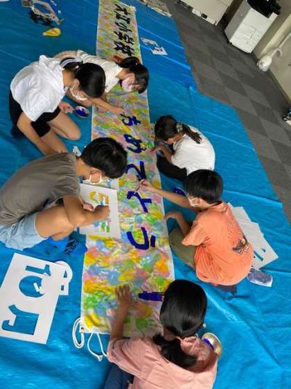 全校児童で作ってきた横断幕がもうすぐ完成します。仕上げは、5・6年の代表委員の子たちが担当します。
