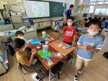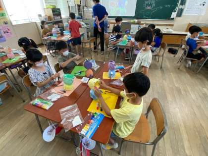 2年生が工作として取り組んでいるのは「かいじゅうガオー」。ペットボトルを活用して顔が回る怪獣を作っていました。
