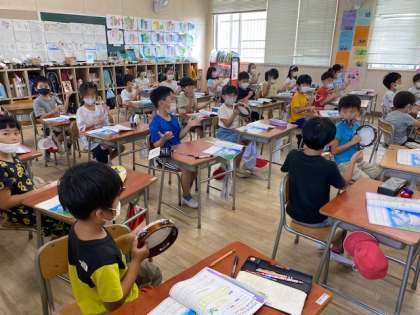 2年生は、カスタネットとタンブリンを使って3拍子のリズムを楽しんでいます。