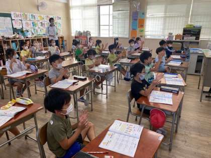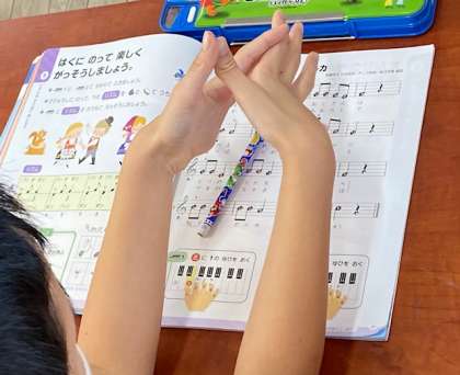 2年生の音楽では「はくにのって楽しく合奏しましょう」と合奏の学習を進めています。今日は、その基本となる8分音符や4分音符、8分休符などが刻む「拍」を意識して手拍子を楽しんでいました。