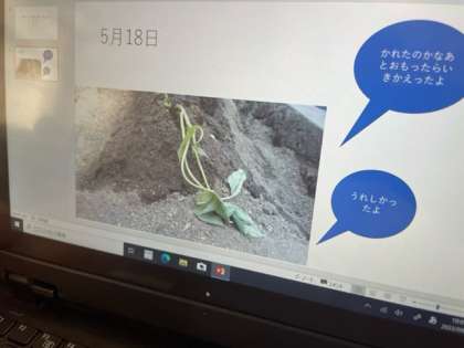5月に植えたサツマイモが大きく成長しています。今日はその様子をタブレットで撮影し、観察記録をつくりました。