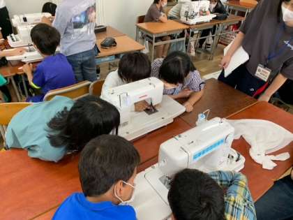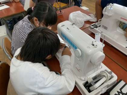 「ミシンでソーイング」の学習が始まりました。前回の授業でボタンの名前や糸をかける場所の名前などを学習し、今日は、実際にミシンに上糸をかける練習をしました。針先の穴に糸を通すのに苦戦していました。