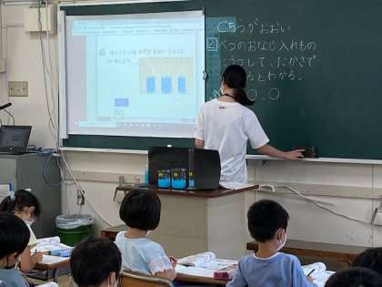 1年生の算数では、異なった容器に入った水の量を比べていました。