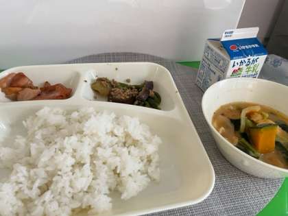 鶏肉のてり焼き、みそ汁、なすのそぼろいため