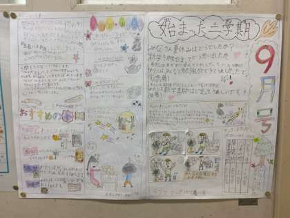 3年生の教室に新聞9月号が貼ってありました。明るい絵や内容に、元気がもらえる新聞です(^^)