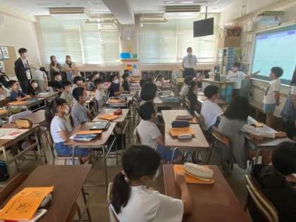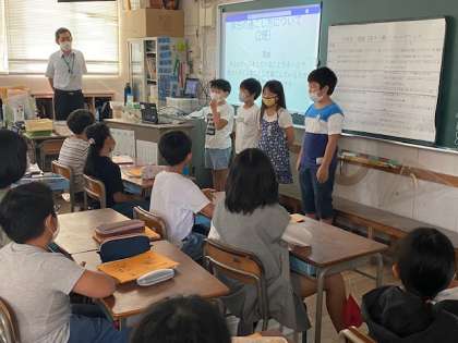 4年生の国語では、子どもたちが日頃、疑問に思っていることを調べ、グラフ化するなどしてプレゼンを作成。今日は、聞くこと話すことを意識して発表していました。