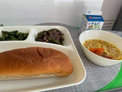 牛肉の香味焼き、ほたて貝とトマトのスープスパゲッティ、さんどまめのサラダ