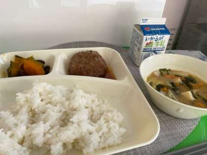 和風ハンバーグ、みそ汁、かぼちゃのいとこ煮