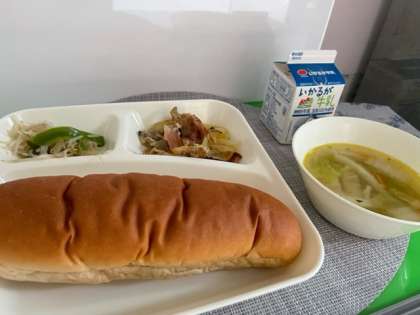 豚肉のカレー風味焼き、はくさいのスープ、もやしとピーマンのいためもの