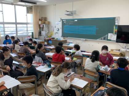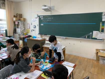 グループごとに3mの紙テープを渡して、4分の3mを切って持ってくるという活動です。「班で話し合い、なぜその長さに切ったのか説明もできるように」と考えさせました。