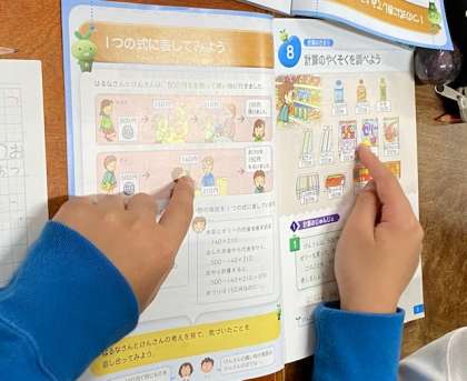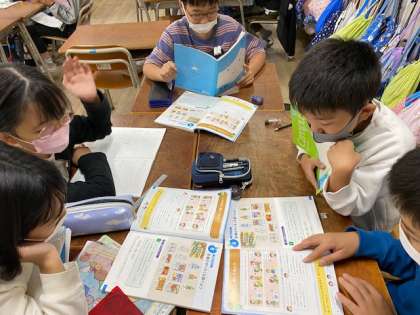 4年生の算数では、「計算の約束を調べよう」ということで、買い物をしておつりをもらう場面の計算式の意味を考えました。自分の考えを発表し合い、班の考えをまとめていきました。