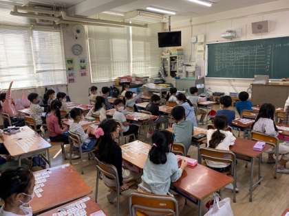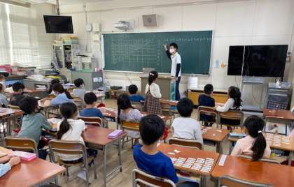 今日の1年生の算数では、先生がならべたカードのきまりを見つけて、答えていました。
