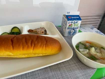 かつおのマリネ焼き、ウインナーとじゃがいものスープ、きゅうりのサラダ