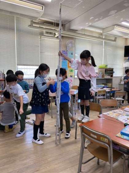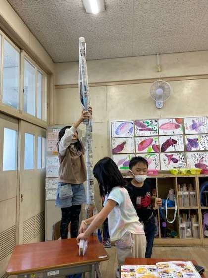 2年生の図工では、「しんぶんしとなかよし」ということで、どれだけ高く積み上げられるかチャレンジしていました。