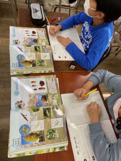 い組は、理科。秋となって木々の様子がどのように変化したのかについて、気づいたことを見つけていました。(3枚目の写真)