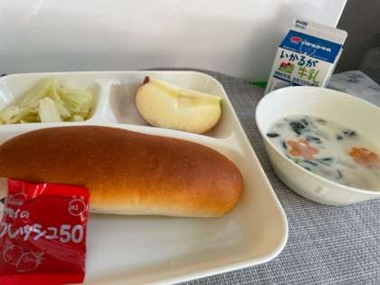 きのこのクリームシチュー、キャベツのピクルス、りんご