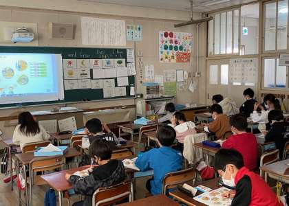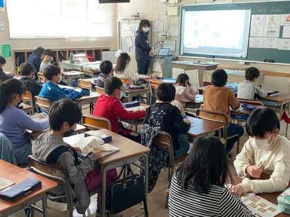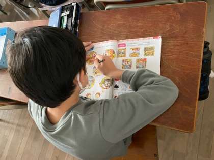 今日の外国語活動は、ヒアリングです。聞こえてくる内容にヒントが隠されていて、特に隠されたアルファベットを聞き分けていました。
