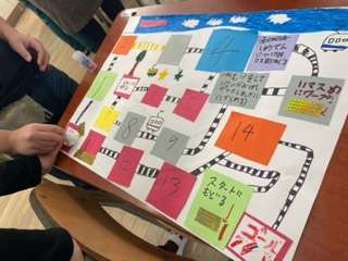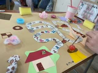「わくわくおはなしゲーム」ですごろくが完成しました。「ものまねをする」「今日の天気を英語で言う」など、工夫をこらしたマスで楽しみました。飾りつけもテーマに沿った素敵なものばかりです(^^)