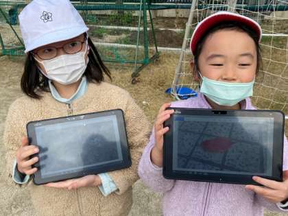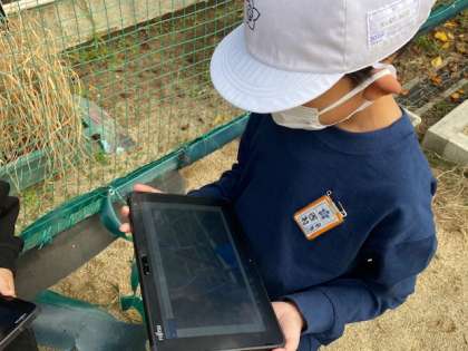 春に見た花や木々などが、秋、どのように変わっているのか、タブレットを持って記録していました。