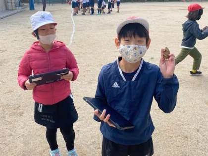 黄色や朱色に色づいた葉っぱや松ぼっくりを拾って見せてくれる子など、それぞれ、季節の変化を感じ取っていました。