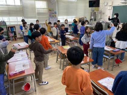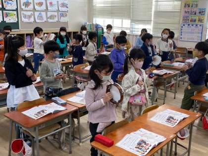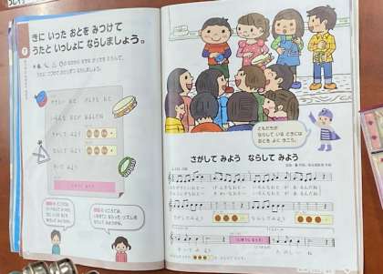 1年生の音楽では、「きにいったおとをみつけて、うたといっしょにならしましょう」ということで、色々な楽器を体験していました。