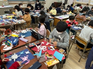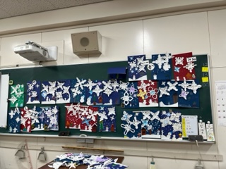 紙を折ったり切ったりして、雪の結晶を作りました。