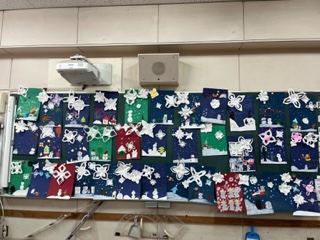 まわりにも雪だるまやツリーなどをいれ、楽しい作品に仕上げることができました。