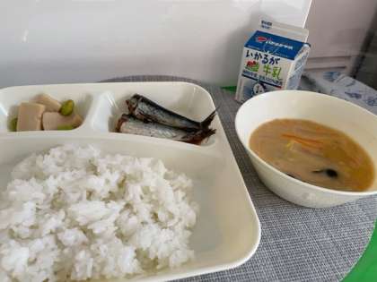 いわしのしょうが煮、みそ汁、高野どうふの煮もの