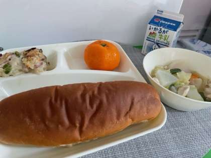 きのこのドリア、鶏肉とじゃがいものスープ煮、みかん
