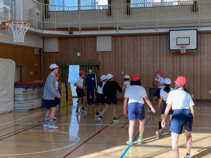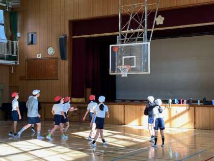 6年生の体育では、体育館を広く使ってバスケットボールのゲームをしていました。