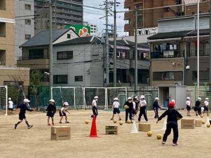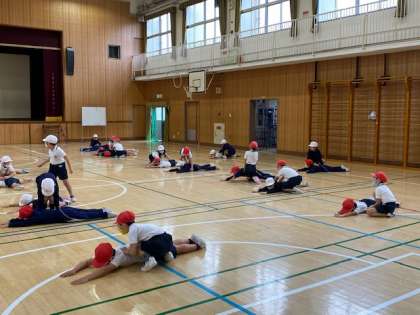 い組は運動場で、持久走やボールけり運動をしていました。的を目がけて蹴ったつもりが色んな方向に飛んでいました。もちろん、的を当てていた子もいましたよ(^^)