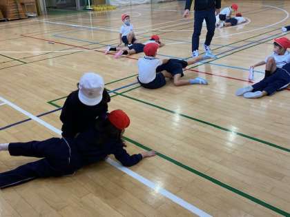 ろ組は体育館で体つくりの運動をしていました。写真は、ひっくり返しゲーム。寝ている子はひっくり返されないように、もう一人の子は、ひっくり返そうとします。