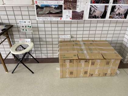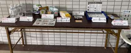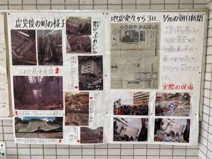 学校の入口には、震災の教訓を風化させまいと、当時の様子や、今できることを考える機会として、展示を行っています。