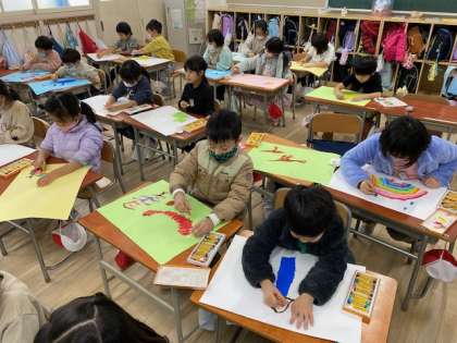 1年生は「○○の上にのって」ということで、自分が考えたものの上に乗っている絵を描いていました。(1枚目)