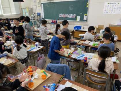 3年生は「あきようきのへんしん」と題して、持ってきた空き容器紙粘土を使って変身させていこうと取り組んでいます。(3枚目)
