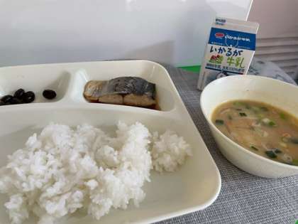 さごしのしょうゆだれかけ、みそ汁、黒豆の煮もの