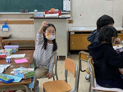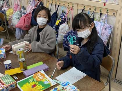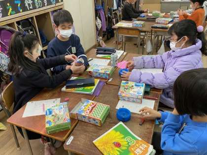 3年生は「どんなものが、じ石につくのだろうか?」とゼムクリップや10円玉、ハサミ、アルミ缶、スチール缶、割り箸や輪ゴムなど、色々なものが磁石につくのかどうか、調べていました。