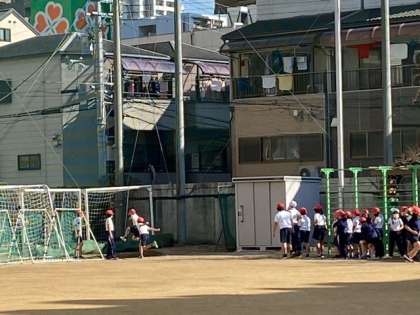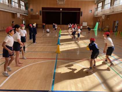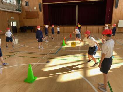 い組は「プレルボール」と言ってテニスに似たゲームをしようと、ボールをバウンドさせて相手にパスをする基本的な動きに取り組んでいました。