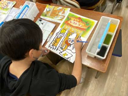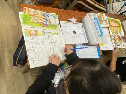 子どもたちは自然につながっているように、絵本に描かれている形や色を見て、描いていました。