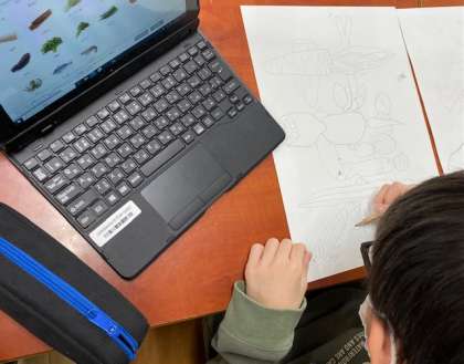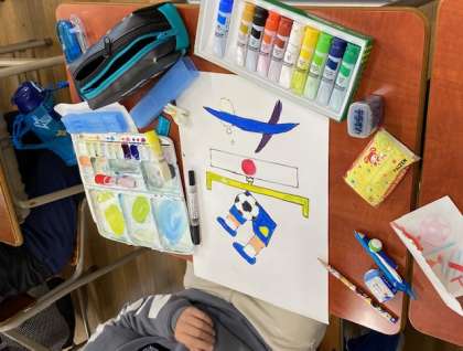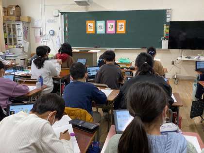 5年生は漢字アートに取り組んでいました。1文字の漢字の意味や連想されるもの、象徴的なことを絵で表現しつつも1文字の漢字として表します。