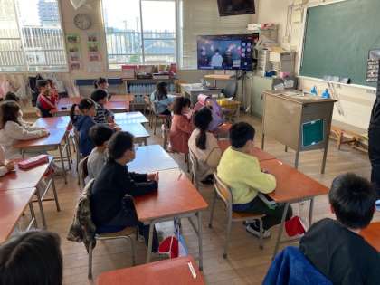給食集会後は、給食委員会の子たちが作成した食育クイズをしました。各学年の子どもたちは楽しみながら食のことを学んでいました。