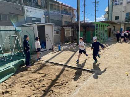 い組は、走り幅跳びをしました。初めてのチャレンジでしたが、砂の柔らかさが分かったのか、思い切って踏み切る子もいました。