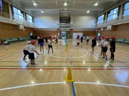 ろ組は、ボールをバウンドさせて相手コートに入れるテニスにも似たプレルボールをしました。どの子も楽しめるゲームなので、グループのみんなが投げて楽しみ方を色々発見していました。