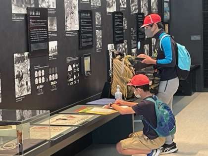映画を見た後各班に分かれ、映像や説明を通して戦争の歴史を詳しく調べています。