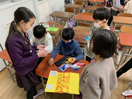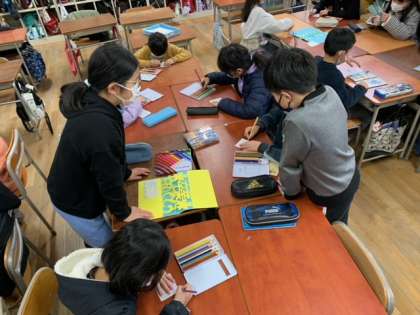 今日の集会は、お世話になった6年に仲良し班でメッセージカードをつくりました!